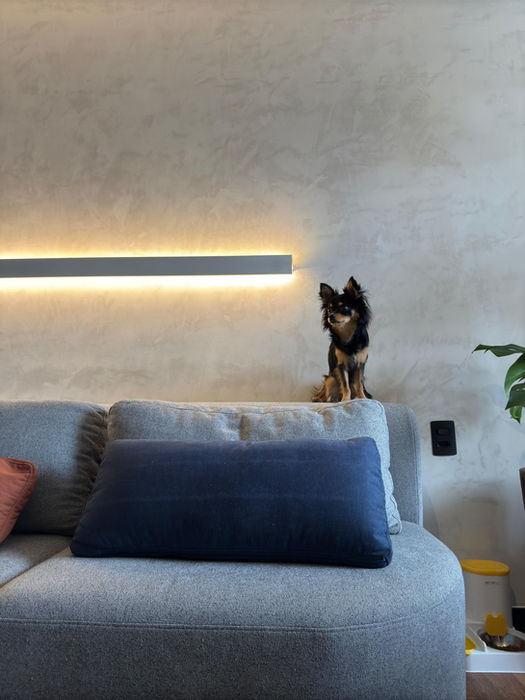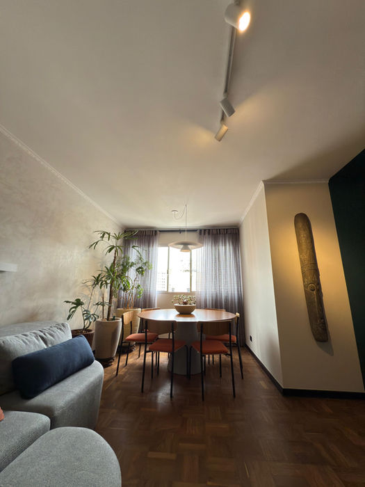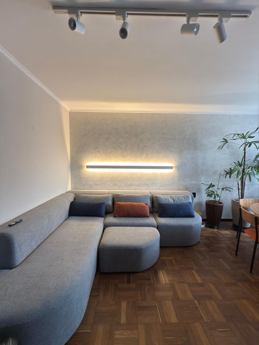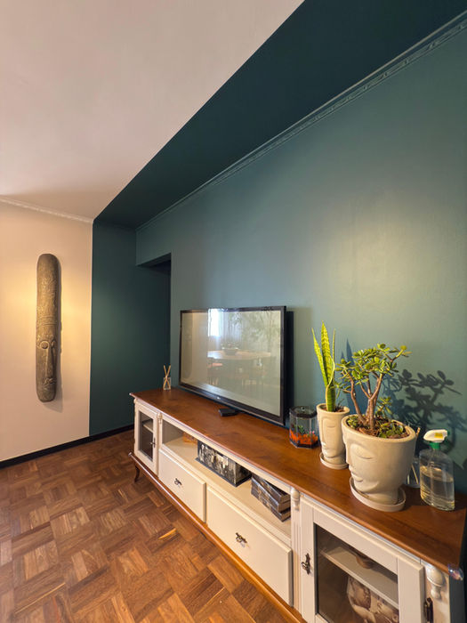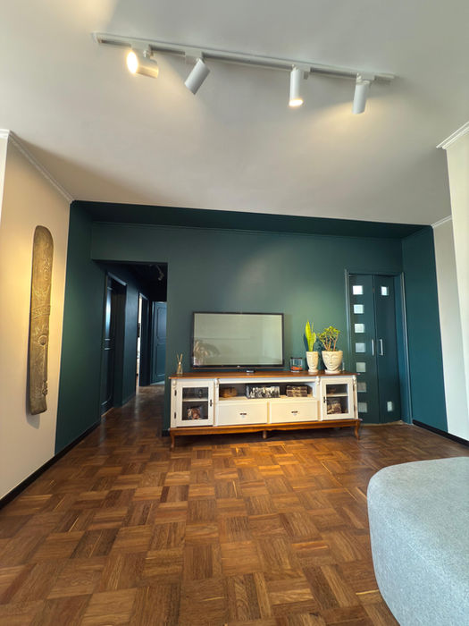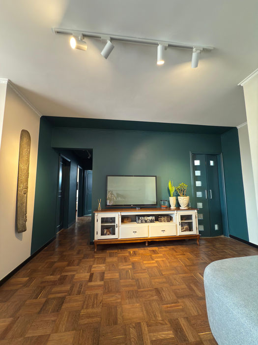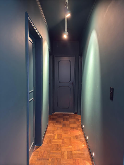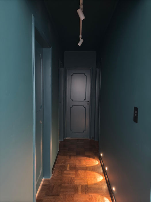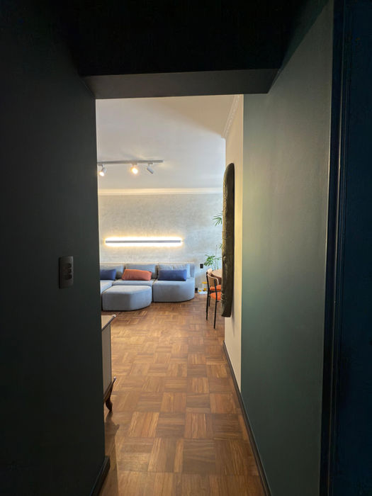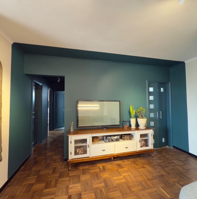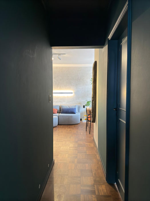 A reforma trouxe uma nova energia para o espaço, sem apagar sua alma. Restauramos os tacos, repensamos os móveis e usamos a técnica de pintura em caixa para setorizar a área íntima, destacando-a com um tom profundo de azul petróleo. O destaque da sala é o sofá em formato generoso, desenhado por nós, com puff solto para permitir diferentes configurações e acolher amigos e familiares com conforto.